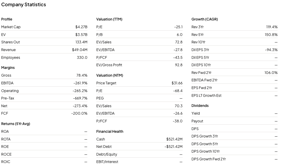 - Αρνητικό P/E, P/FCF: Δείχνει ότι όχι μόνο δεν υπάρχουν κέρδη σήμερα, αλλά και ότι οι αναλυτές δεν προβλέπουν κέρδη μέσα στο επόμενο έτος (NTM).